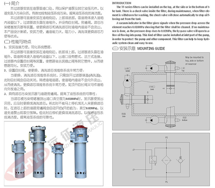 溫州遠征液壓有限公司是一家集開發、生產、服務于一體的綜合性企業,是國內生產液壓輔件(液壓配件_液壓過濾器)的專 業廠家,長期以來為冶金、石油、礦山、工程、建筑、塑機、化工、機床、交通等行業的液壓設備提供配套,同時為引進設備提供高品質的國產化備件。今天遠征主講TF系列箱外自封式吸油過濾器(新型結構代替LXZ系列),詳情請看下圖: