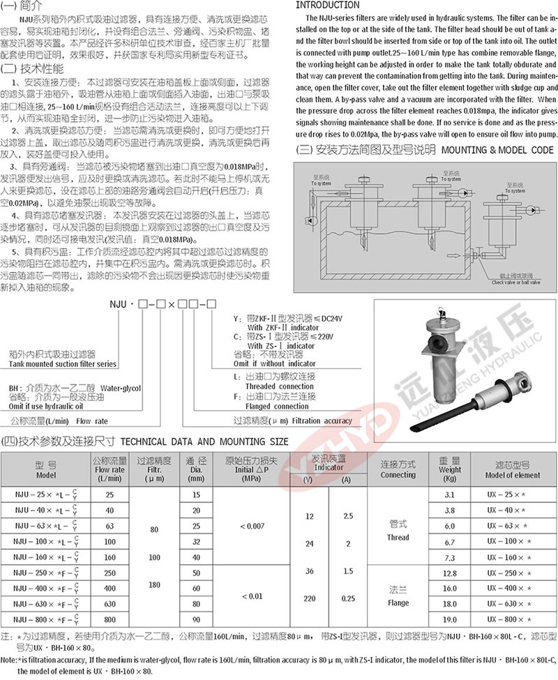)的專 業廠家,長期以來為冶金、石油、礦山、工程、建筑、塑機、化工、機床、交通等行業的液壓設備提供配套,同時為引進設備提供高品質的國產化備件。今天遠征主講NJU系列箱外內積式吸油過濾器,詳情請看下圖: